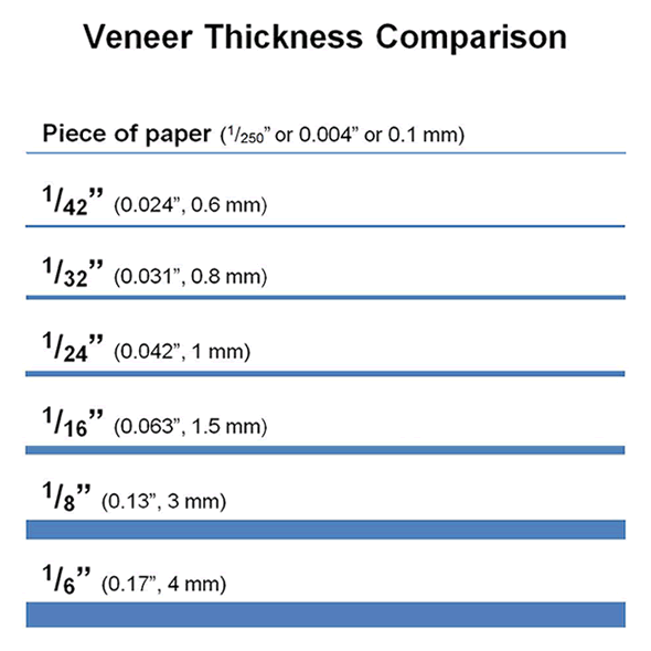 - Unless specified otherwise, the thickness of our veneers is approximately 1/50″ (0.02″) to 1/42″ (0.024″) thick. To help visualize this thickness, we created a Veneer Thickness Comparison graphic.