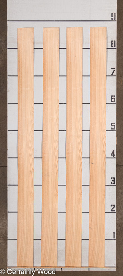Tawny brown with flowing central cathedrals and straight edge grain sliced 1/28″ (0.9 mm) thick