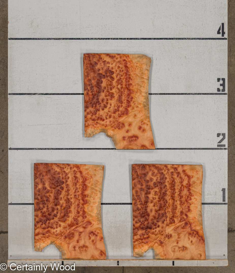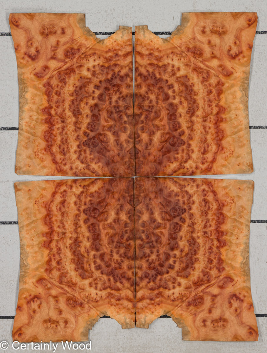 Honey brown background with a very high concentration of cinnamon and darker brown burls, colors from tan to brick red, matches a wide range of woods