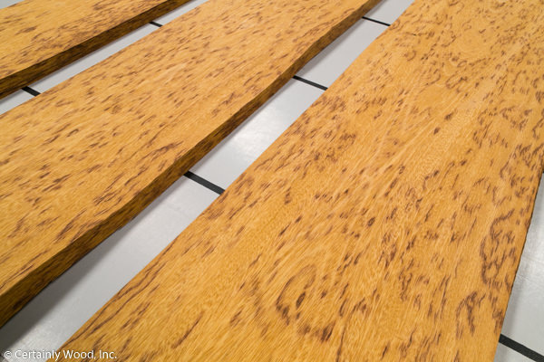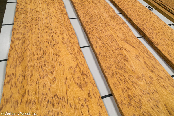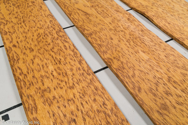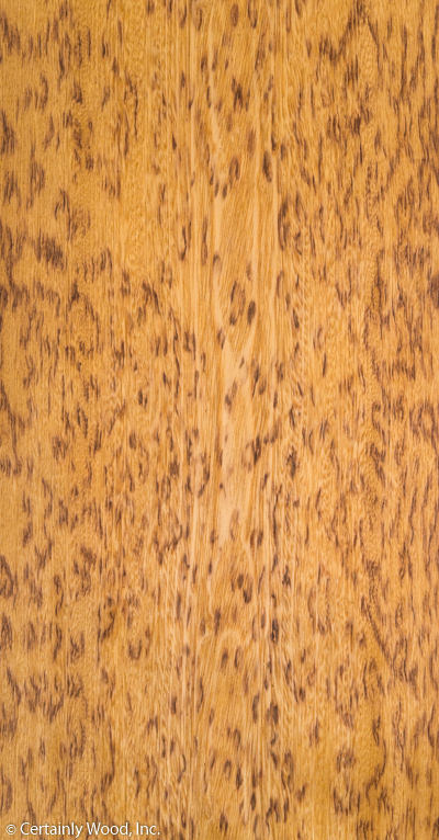 Straw colored with coarse, open grain and covered in darker leopard spots