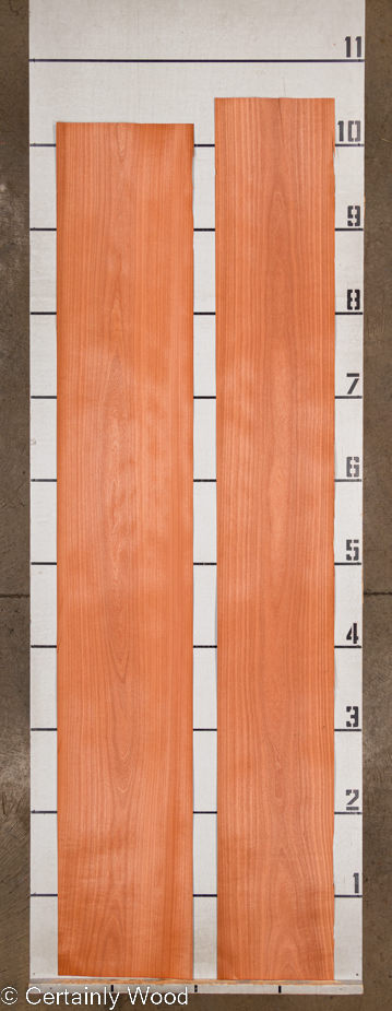 Flat Cut Makore, also known as African Cherry, is a stunning veneer of sleek heartwood saturated with bold orange-reddish and brown tones, occasionally complemented by golden accents. The flat cut reveals gentle cathedrals of uniformally colored grain, providing an elegant and refined appearance. Resembling American Cherry and African Mahogany, Makore serves as a prevalent alternative, offering abundance in yield and a remarkable durability.