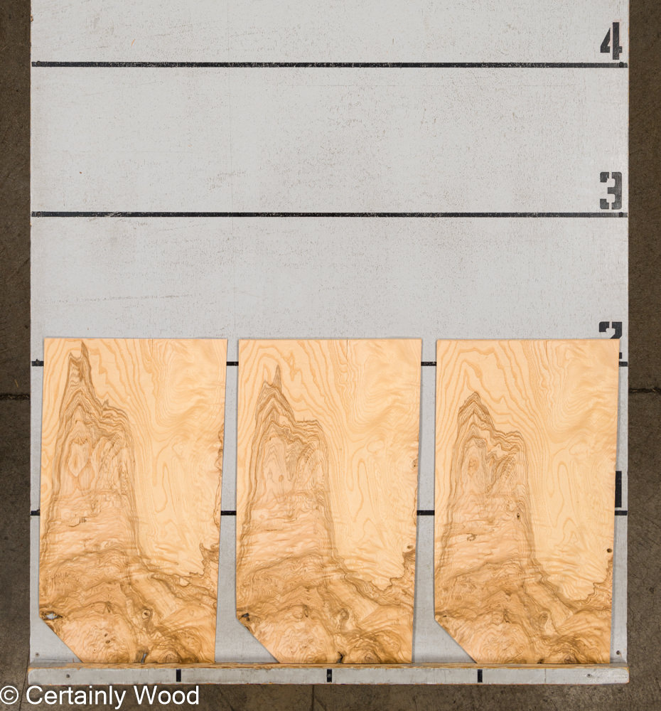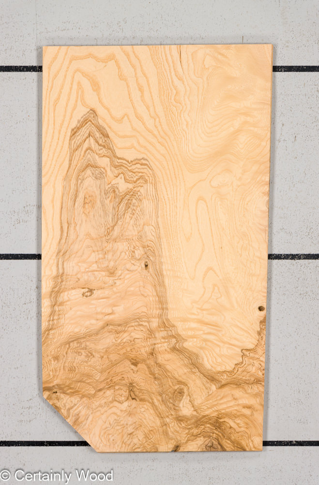 Swirly olive brown lines on an ash background, intensely figured wood and burl clusters