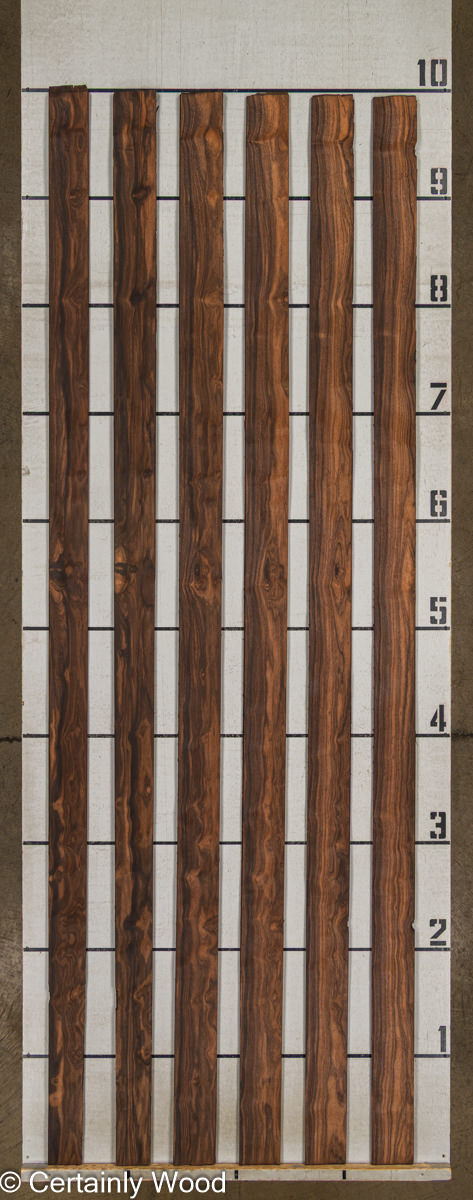 3.5–4.5″ wide full-length net x 119″ long with wild landscape-like grain similar to ziricote. 605 sq. ft. Please call to confirm availability. Take the entire selection for 45% off the list price (no other discounts would apply).