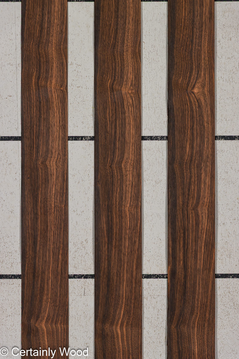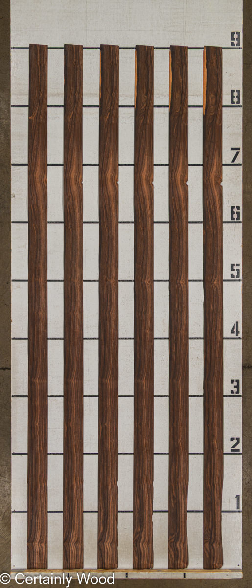 Quarter cut, broad, consistent straight stripe. Thirty years ago we called this type of Macassar ebony “Coromandel” to distinguish it from other ebonies. The blacks are a little deeper and sharper (tres charbonne) and the lights are brighter. Its tighter and smoother than most with a nice luster. Dark and exotic yet bright and alluring-the premium level of a luxury species.
