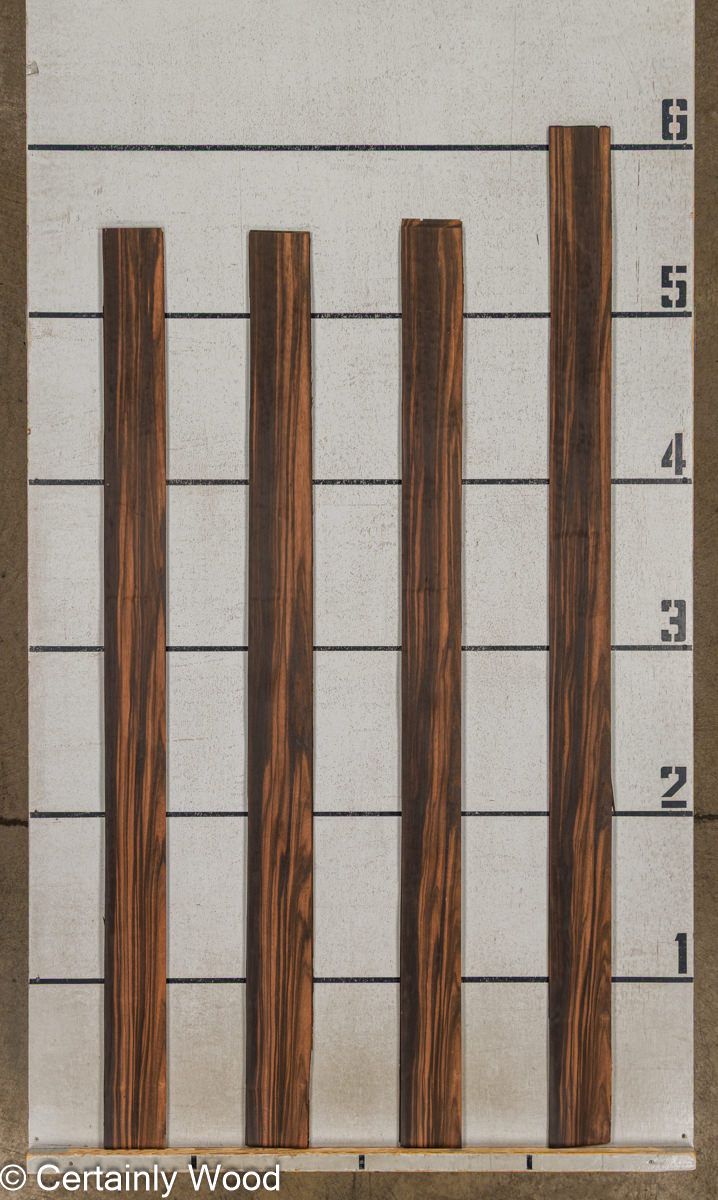 Quarter cut, broad, consistent straight stripe. Thirty years ago we called this type of Macassar ebony “Coromandel” to distinguish it from other ebonies. The blacks are a little deeper and sharper (tres charbonne) and the lights are brighter. Its tighter and smoother than most with a nice luster. Dark and exotic yet bright and alluring-the premium level of a luxury species.