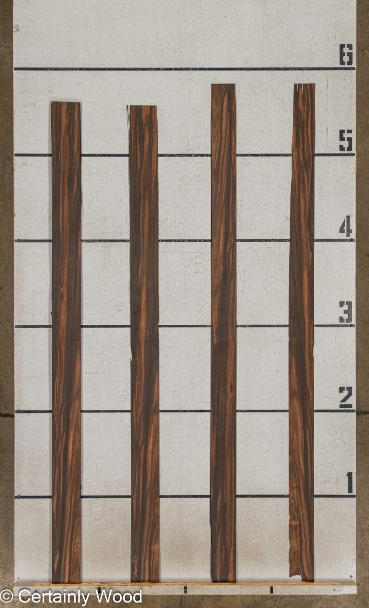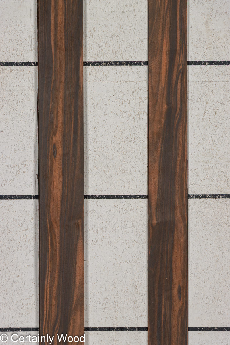 Quarter cut, broad, consistent straight stripe. Thirty years ago we called this type of Macassar ebony “Coromandel” to distinguish it from other ebonies. The blacks are a little deeper and sharper (tres charbonne) and the lights are brighter. Its tighter and smoother than most with a nice luster. Dark and exotic yet bright and alluring-the premium level of a luxury species.