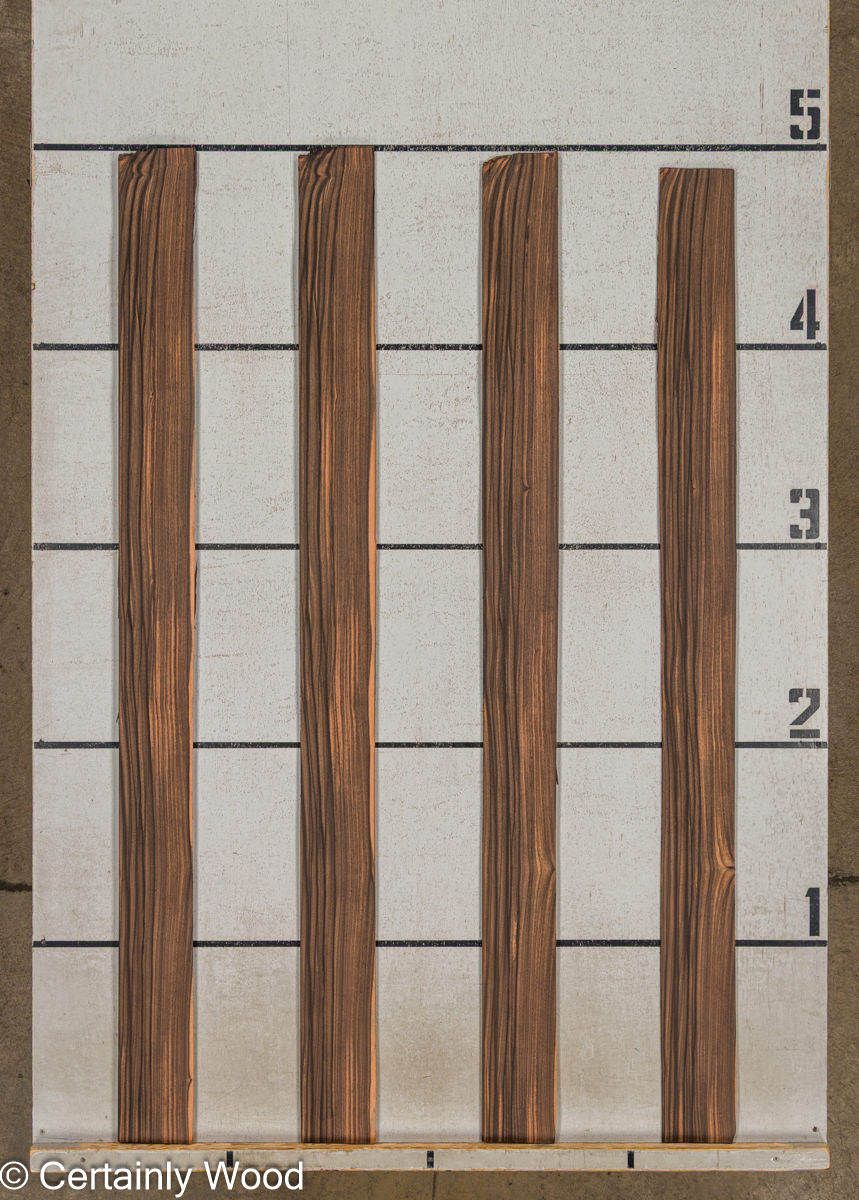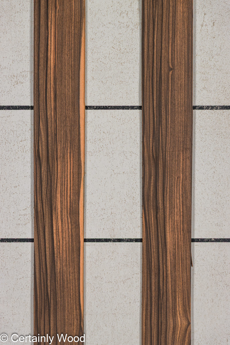 Quarter cut, broad, consistent straight stripe. Thirty years ago we called this type of Macassar ebony “Coromandel” to distinguish it from other ebonies. The blacks are a little deeper and sharper (tres charbonne) and the lights are brighter. Its tighter and smoother than most with a nice luster. Dark and exotic yet bright and alluring-the premium level of a luxury species.