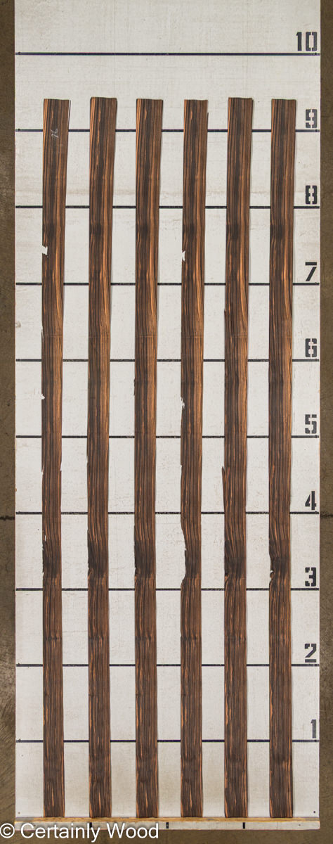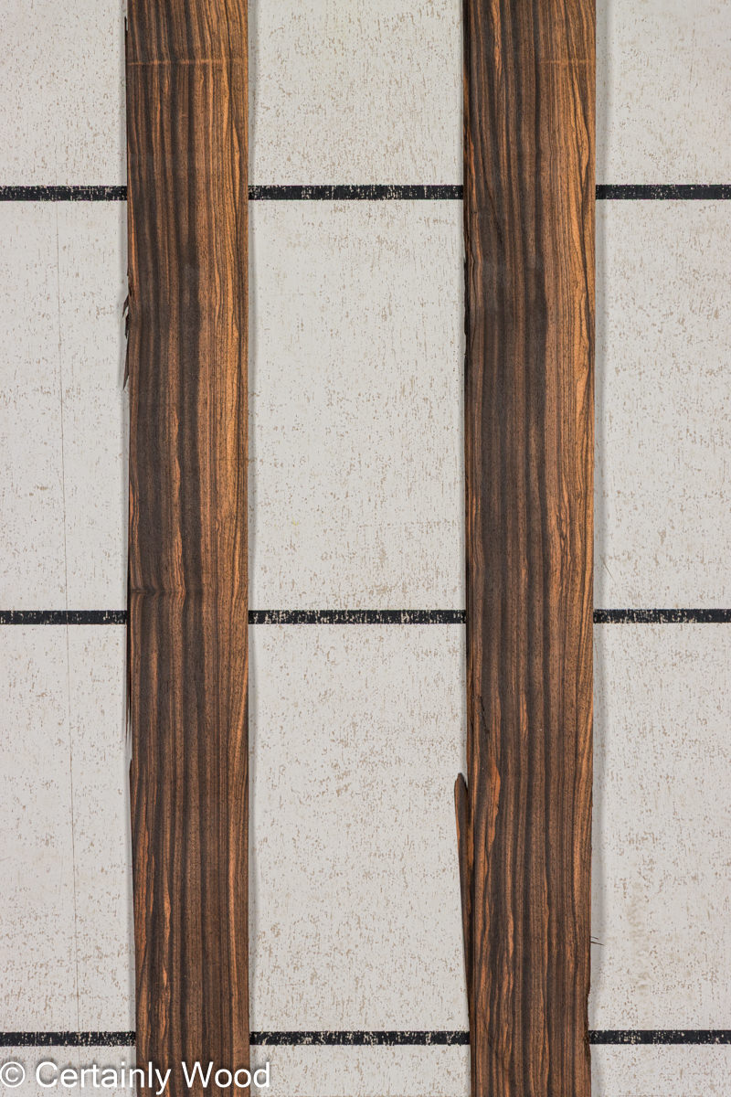 Quarter cut, broad, consistent straight stripe. Thirty years ago we called this type of Macassar ebony “Coromandel” to distinguish it from other ebonies. The blacks are a little deeper and sharper (tres charbonne) and the lights are brighter. Its tighter and smoother than most with a nice luster. Dark and exotic yet bright and alluring-the premium level of a luxury species.