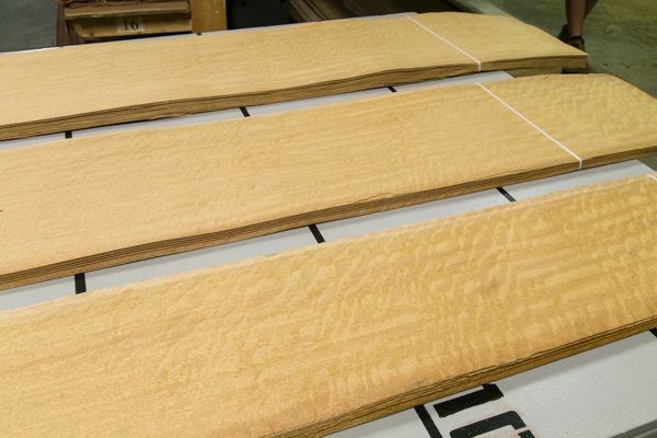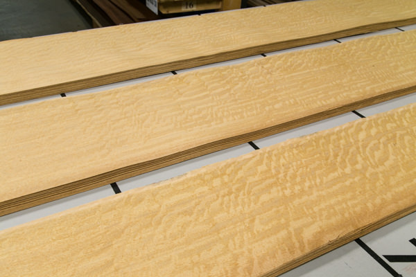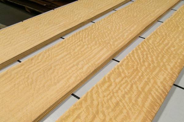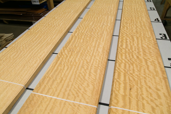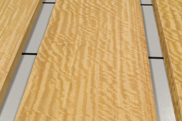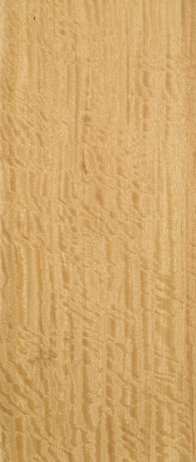 A very bright yellow wood with a bold, wavy fiddleback figure