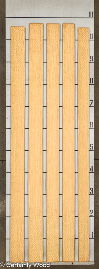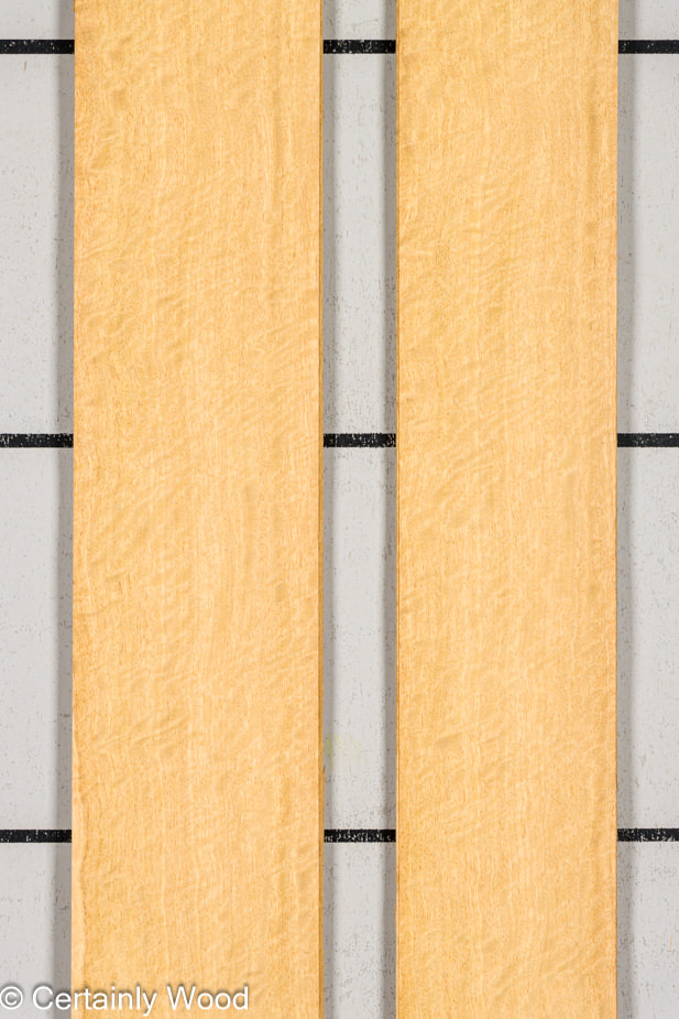 A very bright yellow wood with a bold, wavy fiddleback figure